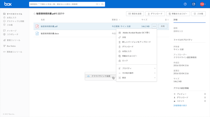 You can right-click on created contracts in “Box” and select “Send with CloudSign” to send the contract from “Box” without having to access “CloudSign” separately. The other party will receive the ordinary CloudSign confirmation request email, which means contracts can be concluded in a matter of just a few minutes at the earliest.