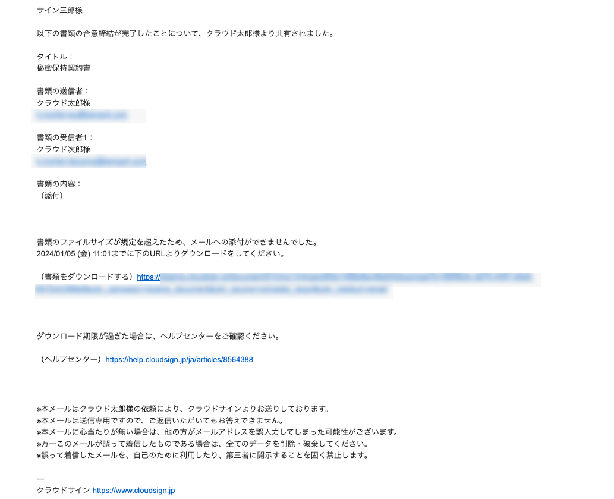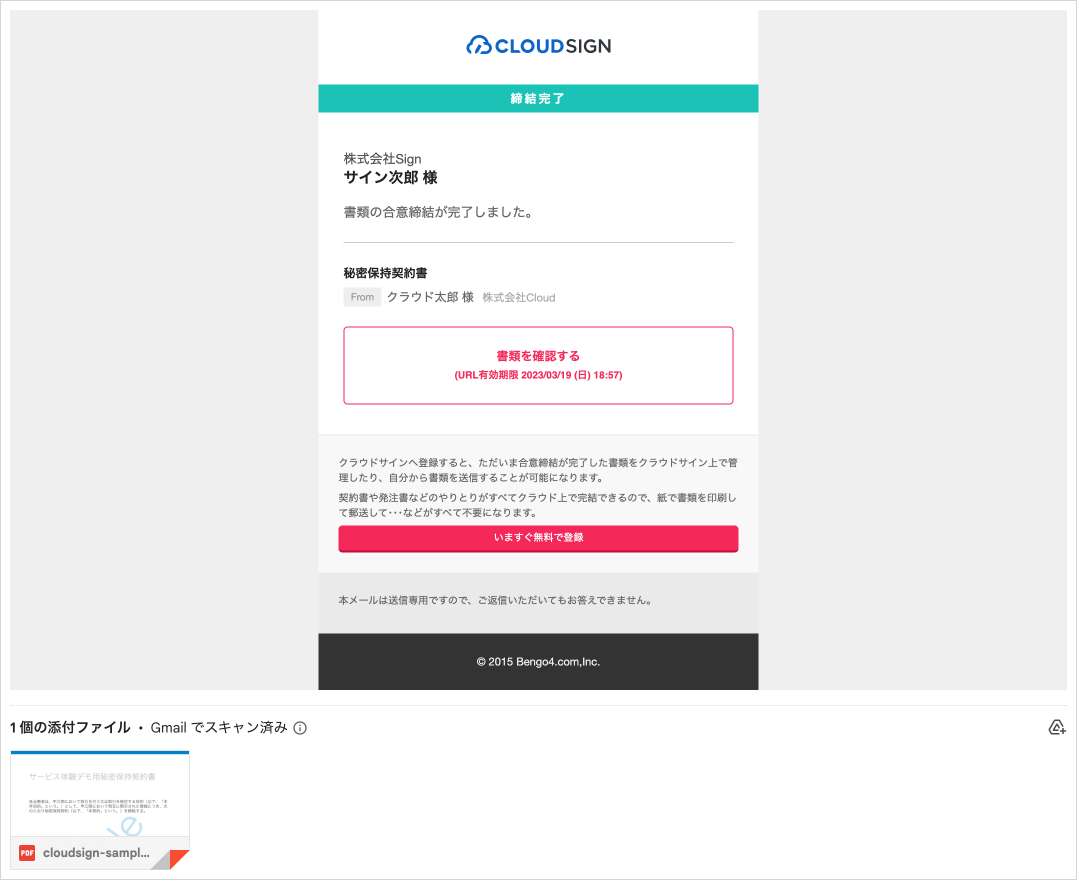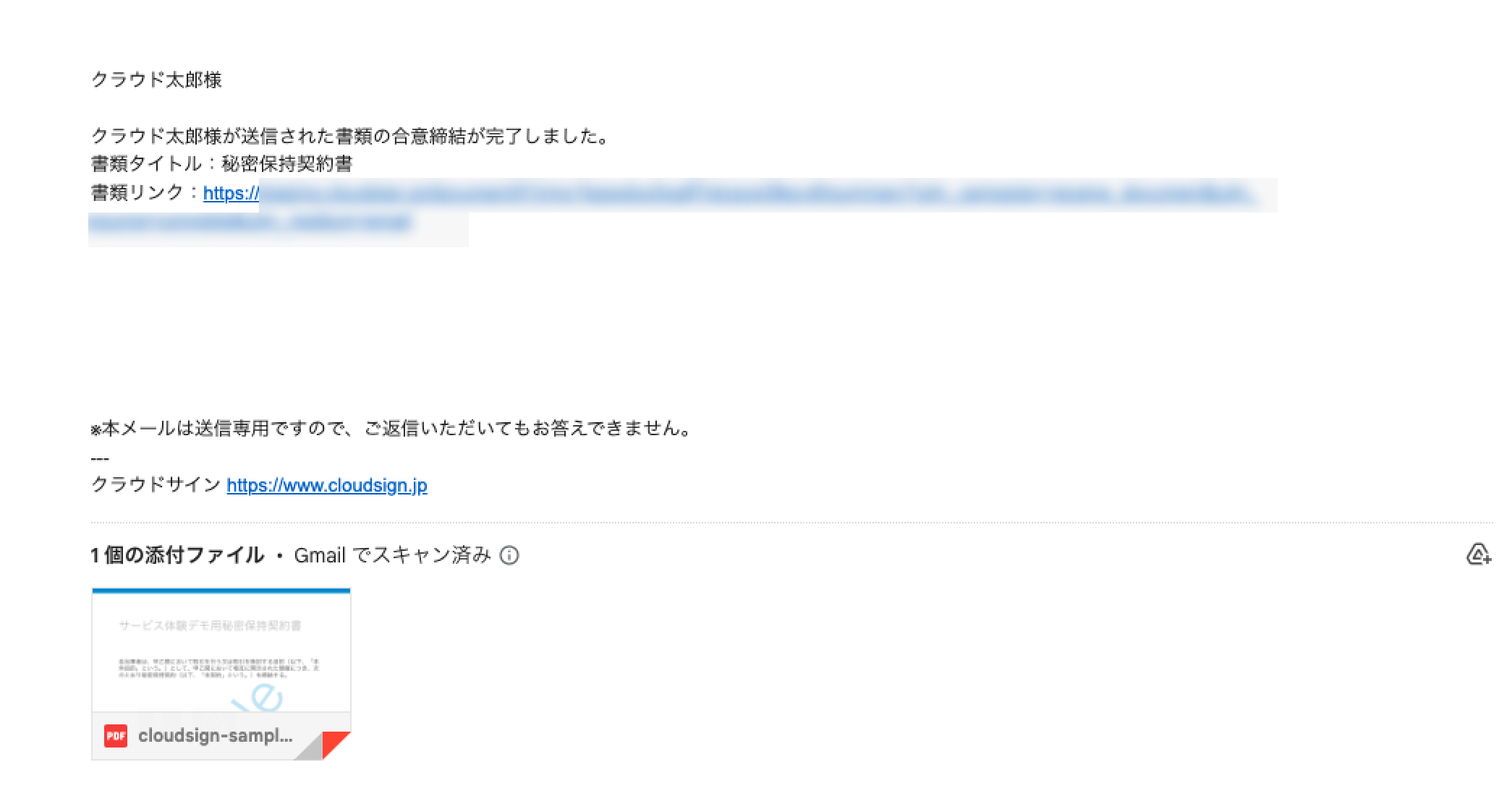 クラウドサイン上で締結済み書類を確認するリンク(有効期限10日間)と添付のPDFファイルより締結済み書類の確認ができます。