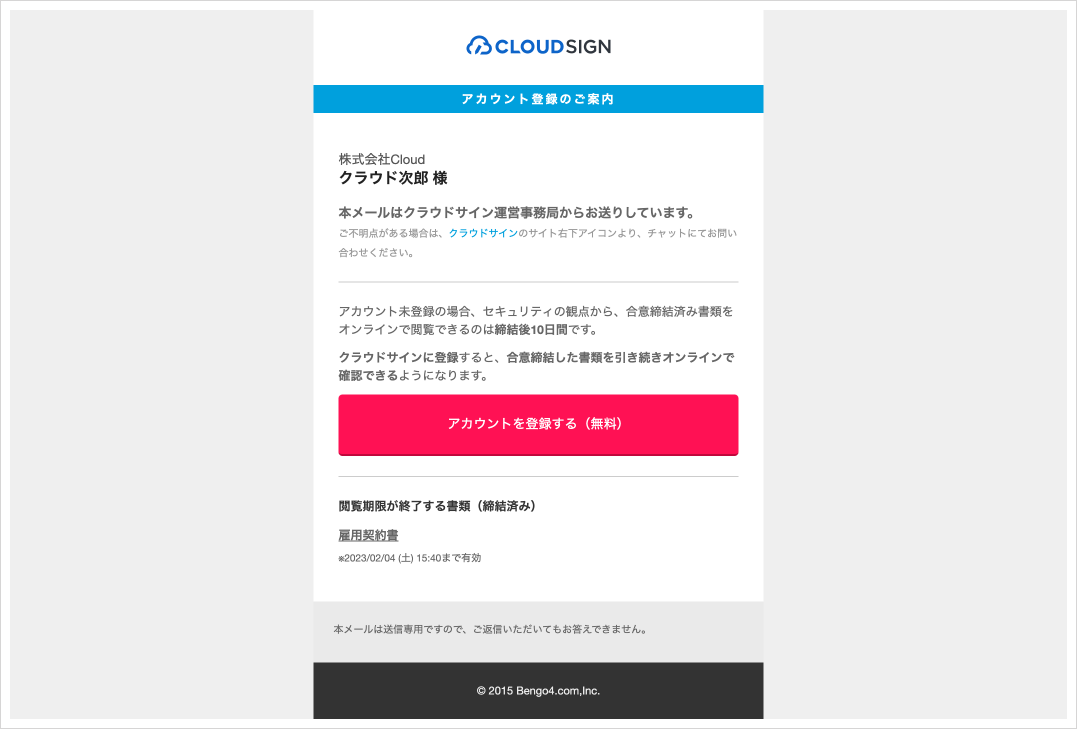 また、締結完了から5日後にアカウント登録のご案内メールが届きます。