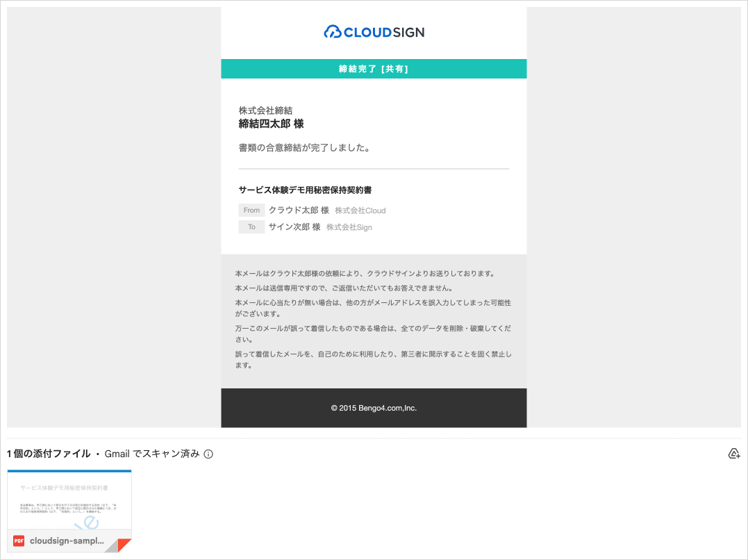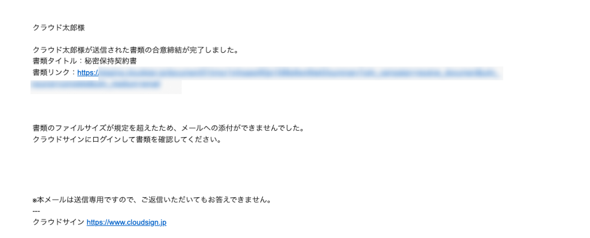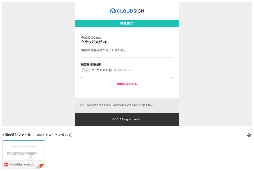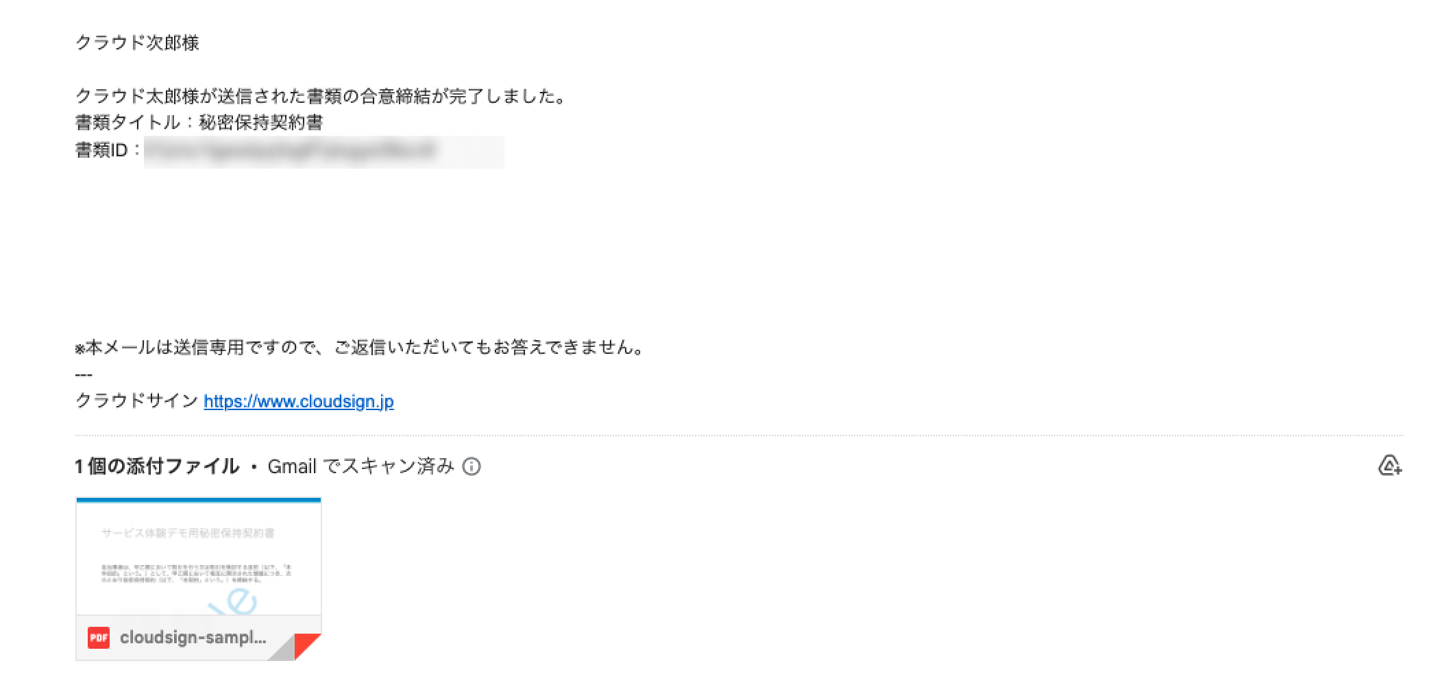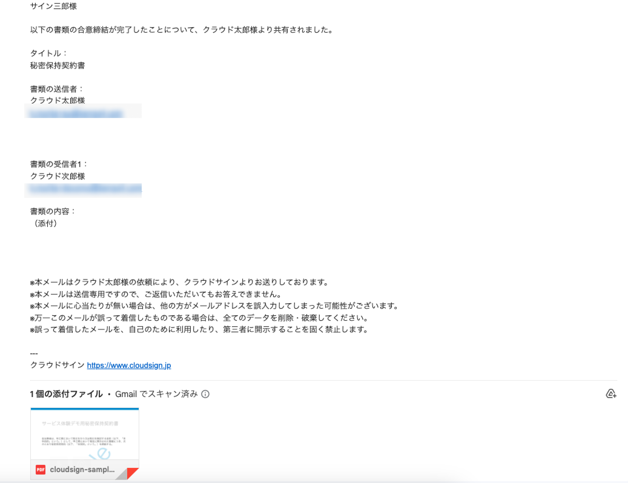 添付のPDFファイルより締結済み書類の確認ができます。クラウドサイン上では確認できません。