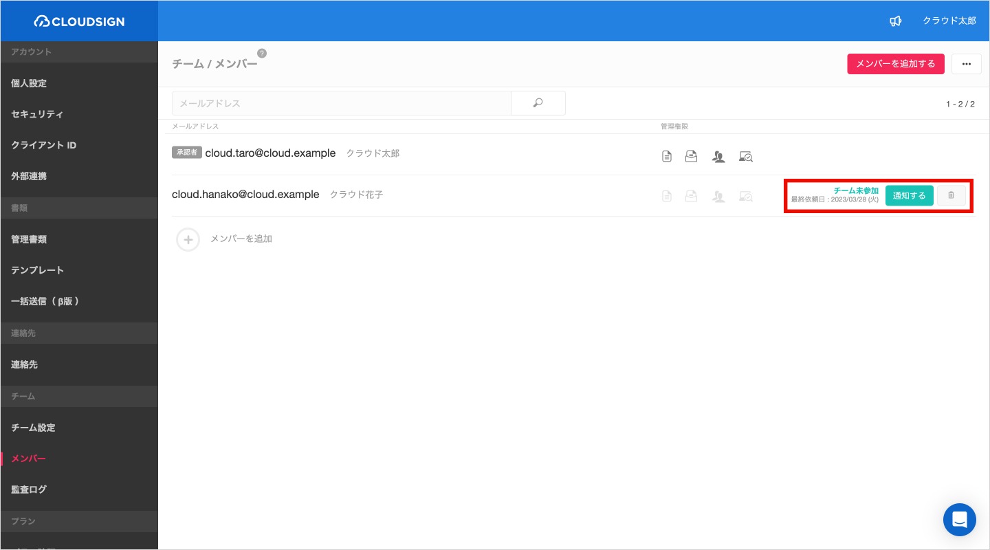 すでにフリープランを利用中のユーザーを追加した場合、ユーザーがチームに参加するまで「チーム未参加」としてステータスが表示されます。