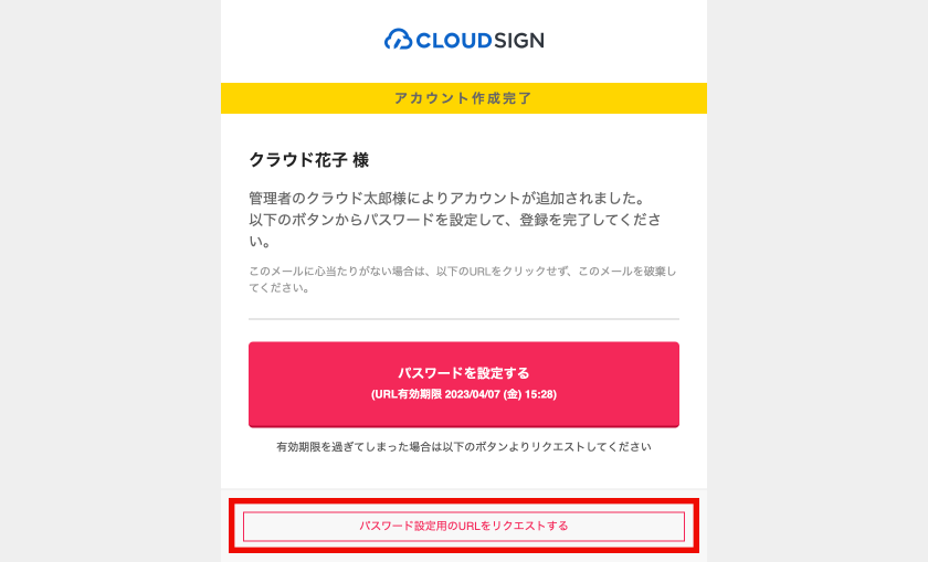 期限が過ぎた場合はメールを受信した方自身が「パスワード設定用のURLをリクエストする」より依頼を行ってください。