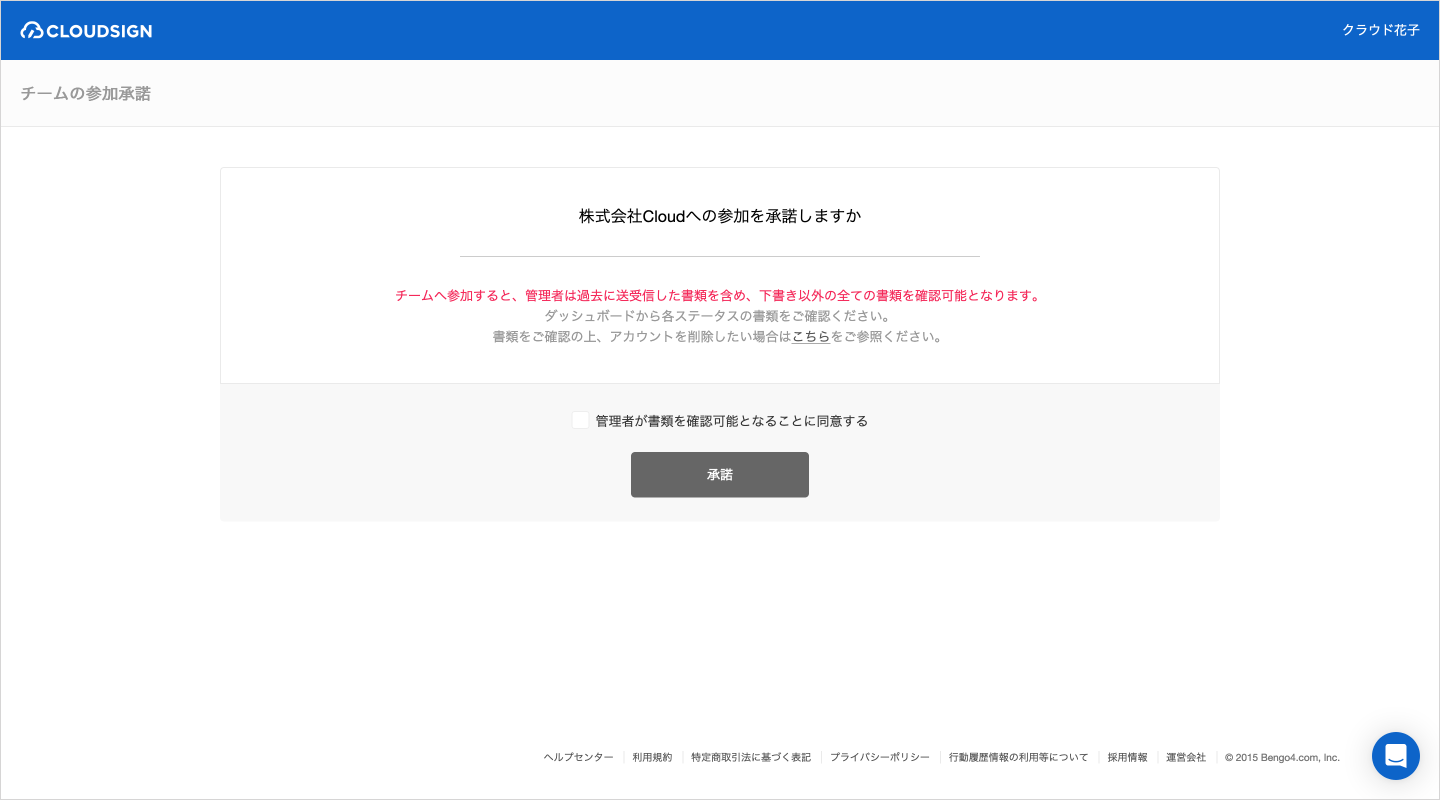 ログイン後、チームへの参加承諾という画面が表示されるので注意事項をご確認の上、チェックを入れて、承諾ボタンをクリックしてください。