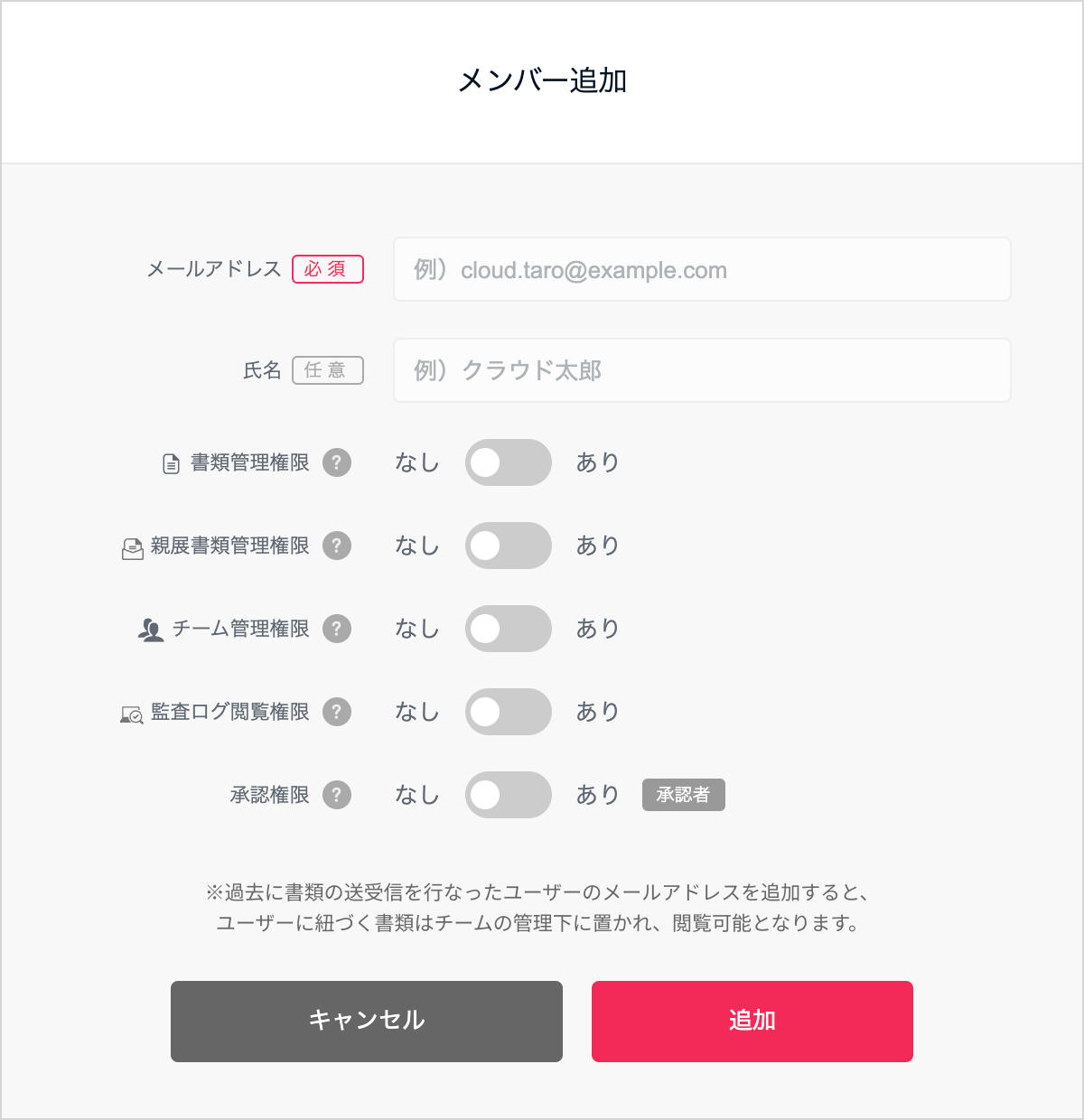 また、同時に管理権限(チーム管理権限/書類管理権限/親展書類管理権限/監査ログ閲覧権限)を付与することも可能です。それぞれの権限で行えることの詳細はこちらをご覧ください。