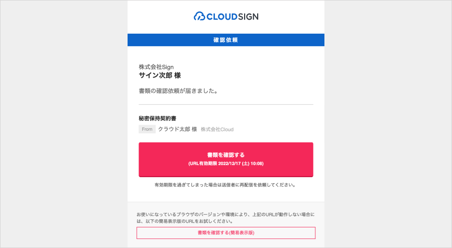 1. クラウドサインから届いた「確認依頼」メールに記載された「書類を確認する」リンクをクリックします。