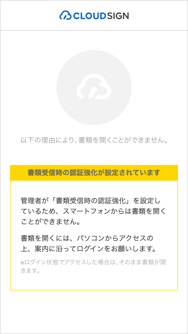 書類受信時の認証強化設定済のチームや組織で受け取った書類は、スマートフォンでは閲覧することはできません。PCでの閲覧をお願いいたします。